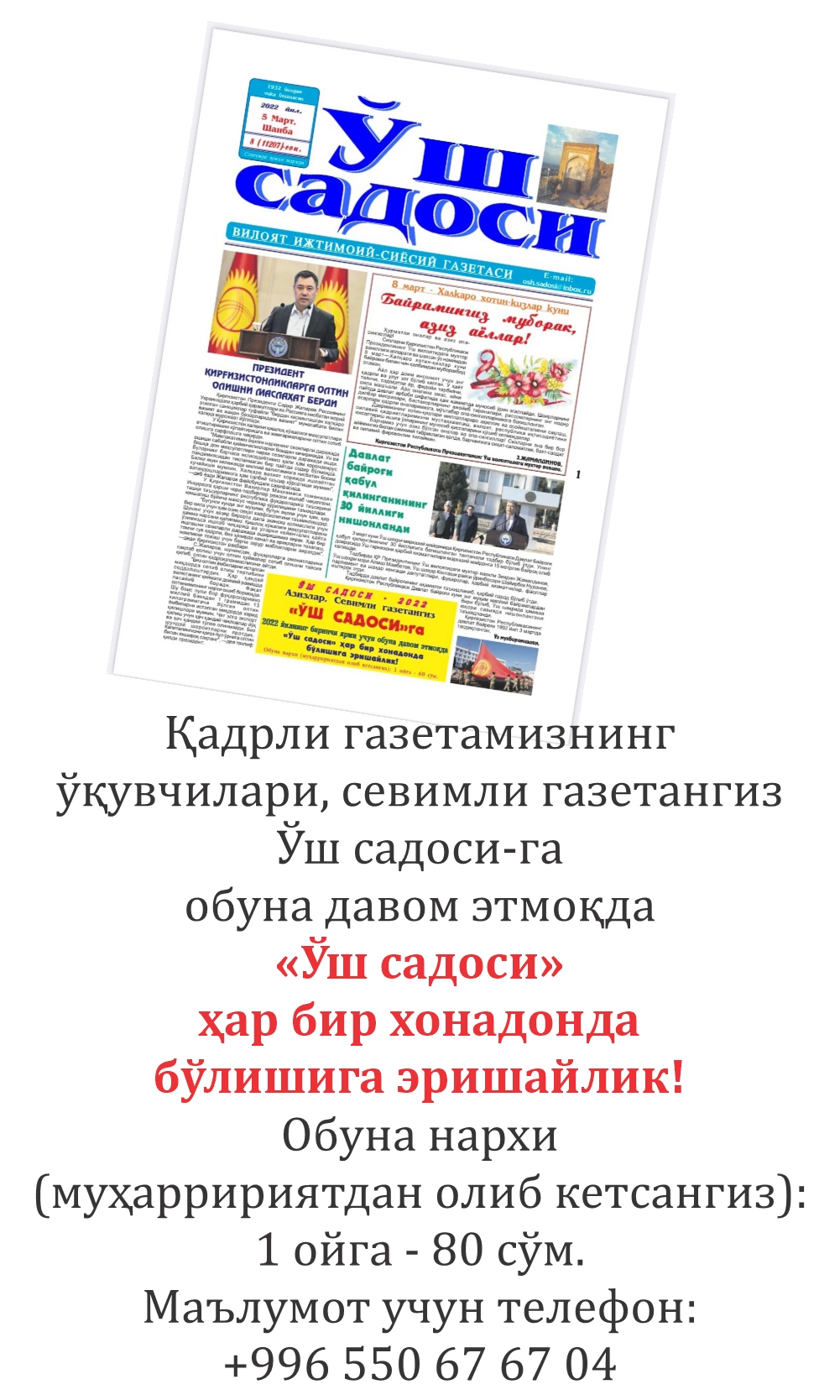 Ўш садоси сайтидаги маълумотларни кўчириш, нусхалаш, тиражлаш, тарқатиш ва бошқа усулда фойдаланиш фақат муҳарририятнинг олдиндан берган ёзма розилиги билан мумкин.