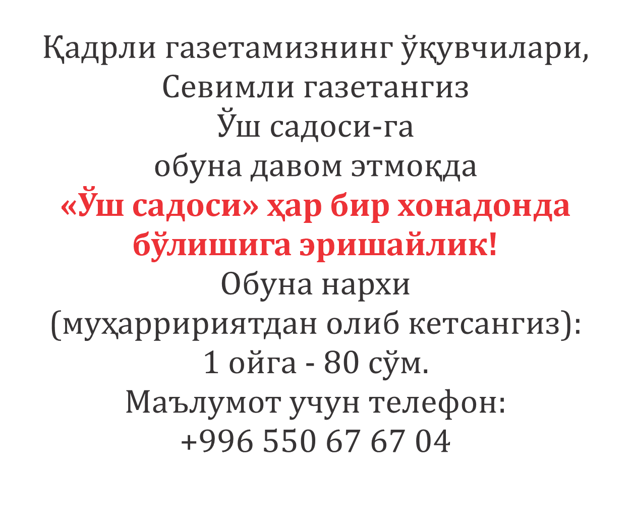 Ўш садоси рекламаларда эълон қилинган маълумотнинг тўғрилиги учун жавобгарликни ўз зиммасига олмайди. Муҳарририят маълумотнома вазифасини бажармайди.